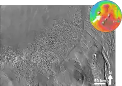 - Gigas Sulci, as seen by THEMIS. Wavy linear ridges are dunes. Dark slope streaks are visible on some slopes if you click on image for larger view.