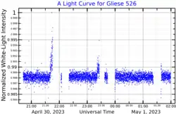 GJ 526 (Lalande 25372, Wolf 498) is a red dwarf star in the northern constellation of Boötes. It has an apparent visual magnitude of 8.5,[3] which is too faint to be seen with the naked eye. Based upon an annual parallax shift of 0.184 arc seconds as measured by the Hipparcos satellite, this system is 17.7 light-years (5.43 parsecs) from Earth.[11]