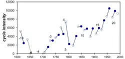 - ↑ Usoskin, I.; Mursula, K.; Arlt, R.; Kovaltsov, G. (2009). "A Solar Cycle Lost in 1793-1800: Early Sunspot Observations Resolve the Old Mystery". Astrophysical Journal Letters. 700 (2): L154 – L157. arXiv:0907.0063. Bibcode:2009ApJ...700L.154U. doi:10.1088/0004-637X/700/2/L154. S2CID 14882350.