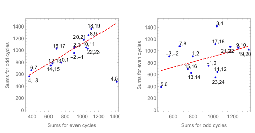 Figure 1. Illustration of the GO rule. The blue circles are pairs of cycles, the dashed red lines are linear regressions (the pair 4-5 is excluded from the left regression). The Pearson correlation coefficients are R=0.91 for even-odd pairs (the left panel) and R=0.41 for odd-even ones (the right panel).