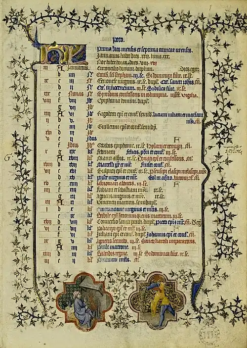 The golden number, as it was later called, first appears in a calendar composed by Abbo of Fleury around the year 1000. Around 1162 a certain Master William referred to this number as the golden number "because it is more precious than the other numbers."[1] The name refers to the practice of printing golden numbers in gold.[2] The term became widely known and used, in part through the computistic poem Massa Compoti written by Alexander de Villa Dei around 1200.[3]