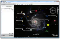 New features such as multi-wavelength data, positions of major satellites and their orbits as well as educational resources are provided to the Google Earth community and also through Christian and Conti's website for Sky.[43] Also visible on Sky mode are constellations, stars, galaxies, and animations depicting the planets in their orbits. A real-time Google Sky mashup of recent astronomical transients, using the VOEvent protocol, is provided by the VOEventNet collaboration.[44] Other programs similar to Google Sky include Microsoft WorldWide Telescope and Stellarium.