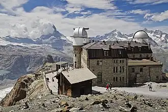 A first hotel was built on the Gornergrat in 1896, two years before the completion of the Gornergrat rack railway. As the tourist traffic increased, the current larger hotel was built between 1897 and 1907. Given the clean air and good light conditions of the area, a dome was built on each of the two towers of the hotel in 1996. The KOSMA telescope was installed in the southern tower while the Gornergrat Infrared Telescope was installed in the northern tower.[1]
