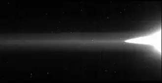 The existence of the Jovian rings was inferred from observations of the planetary radiation belts by Pioneer 11 spacecraft in 1975.[35] In 1979 the Voyager 1 spacecraft obtained a single overexposed image of the ring system.[1] More extensive imaging was conducted by Voyager 2 in the same year, which allowed rough determination of the ring's structure.[5] The superior quality of the images obtained by the Galileo orbiter between 1995 and 2003 greatly extended the existing knowledge about the Jovian rings.[2] Ground-based observation of the rings by the Keck[4] telescope in 1997 and 2002 and the HST in 1999[3] revealed the rich structure visible in back-scattered light. Images transmitted by the New Horizons spacecraft in February–March 2007[13] allowed observation of the fine structure in the main ring for the first time. In 2000, the Cassini spacecraft en route to Saturn conducted extensive observations of the Jovian ring system.[36] Future missions to the Jovian system will provide additional information about the rings.[37]