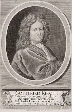 Gottfried Kirch (German: [ˈkɪʁç]; also Kirche[1] [ˈkɪʁçə], Kirkius;[1] 18 December 1639 – 25 July 1710) was a German astronomer and the first "Astronomer Royal" in Berlin and, as such, director of the nascent Berlin Observatory.