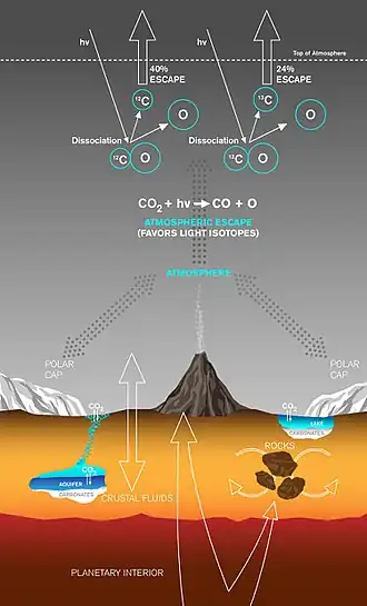 The sublimation-condensation cycle of carbon dioxide on Mars between the atmosphere and cryosphere (polar ice cap) operates seasonally.[8] This cycle contributes as almost the only variable accounting for changes in gravity field on Mars.[8] The measured gravitational potential of Mars from orbiters could be generalized as the equation below,