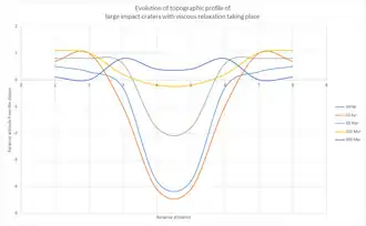 After the initial impact, high heat flux and high water content would have favored viscous relaxation to take place. The crust becomes more ductile. The basin topography of the craters is thus subjected to greater stress due to self-gravitation, which further drive crustal flow and decay of relief. However, this analysis may not work for giant impact craters such as Hellas, Utopia, Argyre and Isidis basins.[25]