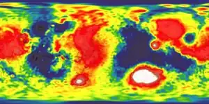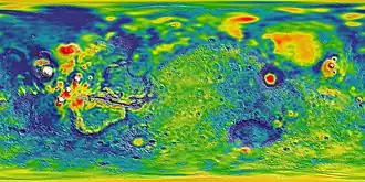 Mars free-air gravity map produced along with the GMM-3 gravity solution[13] (Red: gravity high; Blue: gravity low) (Credit: NASA's Scientific Visualization Studio)