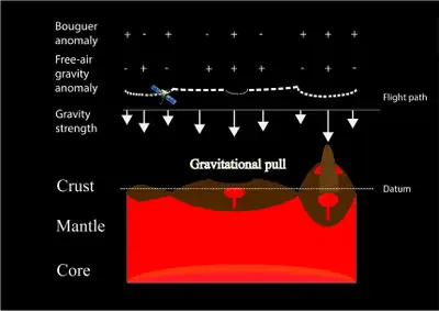 Free-air gravity anomalies are relatively easier to measure than the Bouguer anomalies as long as topography data is available because it does not need to eliminate the gravitational effect due to the effect of mass surplus or deficit of the terrain after the gravity is reduced to sea level. However, to interpret the crustal structure, further elimination of such gravitational effect is necessary so that the reduced gravity would only be the result of the core, mantle and crust below datum.[5] The product after elimination is the Bouguer anomalies. However, density of the material in building up the terrain would be the most important constraint in the calculation, which may vary laterally on the planet and is affected by porosity and geochemistry of the rock.[5][9] Relevant information could be obtained from Martian meteorites and in-situ analysis.