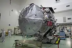 The Gravity Science experiment and instrument set aboard the Juno Jupiter orbiter is designed to monitor Jupiter's gravity.[1][2][3] It maps Jupiter's gravitational field, which will allow the interior of Jupiter to be better understood.[3] It uses special hardware on Juno, and also on Earth,[1] including the high-gain K-band and X-band communication systems of the Deep Space Network as well as Juno's Ka-band Translator System (KaTS).[1][4] These components work together to detect minute changes in radio frequency (Doppler shift) to measure the spacecraft's velocity over time.[5] The KaTS box was funded by the Italian Space Agency and overseen by professor Luciano Iess from University La Sapienza in Rome.[4] KaTS detects signals coming from the DSN on Earth, and then sends replies in a very precise way that allows the velocity of Juno to be determined to within 0.001 millimeters per second.[4] The spacecraft receives a tone signal on the Ka band and then replies using the X-band radio.[1]