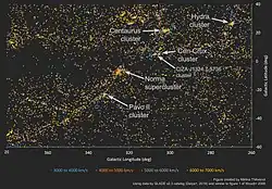 Intense efforts during the late 1990s, to work through the difficulties caused by the occlusion by the Milky Way, identified the Norma Cluster at the center of the Great Attractor region.[1]