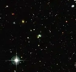 - ↑ C. Cardamone; K. Schawinski; M. Sarzi; S.P. Bamford; N. Bennert; C.M. Urry; C. Lintott; W.C. Keel; J. Parejko; R.C. Nichol; D. Thomas; D. Andreescu; P. Murray; M.J. Raddick; A. Slosar; A. Szalay; J. Vandenberg (2009). "Galaxy Zoo Green Peas: Discovery of A Class of Compact Extremely Star-Forming Galaxies". Monthly Notices of the Royal Astronomical Society. 399 (3): 1191–1205. arXiv:0907.4155. Bibcode:2009MNRAS.399.1191C. doi:10.1111/j.1365-2966.2009.15383.x. S2CID 14663963.