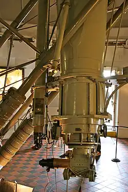 The Greenwich 28-inch refractor is a telescope at the Royal Observatory, Greenwich, where it was first installed in 1893. It is a 28-inch ( 71 cm) aperture objective lens telescope, otherwise known as a refractor, and was made by the telescope maker Sir Howard Grubb. The achromatic lens was made Grubb from Chance Brothers glass.[1] The mounting is older however and dates to the 1850s, having been designed by Royal Observatory director George Airy and the firm Ransomes and Simms.[2][1] The telescope is noted for its spherical dome which extends beyond the tower, nicknamed the "onion" dome.[3] Another name for this telescope is "The Great Equatorial" which it shares with the building, which housed an older but smaller telescope previously.[4]