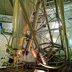 The mounting was designed by George Airy in the 1850s, for the older 13-inch refractor, in conjunction with the firm Ransomes and Simms.[1] It is an equatorial design, that allows the telescope to rotate to compensate for the rotation of the Earth; this allows the telescope to stay fixed on certain point in the heavens.[1][13] The telescope tube is mounted in a latticework of iron, that is mounted on each end on spindle that rest on a stone and metal pier.[1]