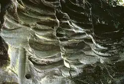 The dates and function of the grooves on Gotland have seen debate in recent decades between archaeologists who argue for a High Medieval date and some industrial function,[6][7] and proponents of an alternative theory who argue for a Neolithic date and a ritual calendar function. The latter support their view mainly with the idea that the direction of each groove might be given an astronomical interpretation, where each groove would mark a sightline towards a certain celestial phenomenon that may be reconstructed for a certain year during the Stone Age.[5] The grooves under overhangs in Scania cannot have been used as sightlines in this suggested manner.