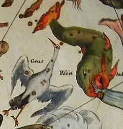 The stars that form Grus were originally considered part of the neighbouring constellation Piscis Austrinus (the southern fish), with Gamma Gruis seen as part of the fish's tail.[2] The stars were first defined as a separate constellation by the astronomer Petrus Plancius, who created twelve new constellations based on the observations of the southern sky by the Dutch explorers Pieter Dirkszoon Keyser and Frederick de Houtman, who had sailed on the first Dutch trading expedition, known as the Eerste Schipvaart, to the East Indies. Grus first appeared on a 35-centimetre-diameter celestial globe published in 1598 in Amsterdam by Plancius with Jodocus Hondius. Its first depiction in a celestial atlas was in the German cartographer Johann Bayer's Uranometria of 1603.[3] De Houtman included it in his southern star catalogue the same year under the Dutch name Den Reygher, "The Heron",[4] but Bayer followed Plancius and Hondius in using Grus.[2]