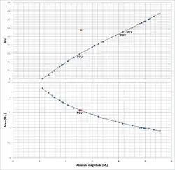 - ↑ The relevant calculation for absolute magnitude is , where is the apparent magnitude and is the distance in light-years. The large error compared to the error on observed magnitude is due to the substantial error in distance.