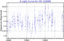 HD 124099 has a stellar classification of K2 IIp,[4] indicating that it is an evolved K-type bright giant with peculiarities in its spectrum; the peculiarity being that it has either a very weak or no G-band in its spectrum. It has 4.22 times the mass of the Sun[9] but it has expanded to 71.4 times the radius of the Sun.[10] It radiates 1,545 times the luminosity of the Sun from its enlarged photosphere at an effective temperature of 4,426 K.[11] However, Gaia DR3 stellar evolution models give a larger radius of 99.4 R☉ and a higher luminosity of 2,926 L☉.[1] HD 124099 is metal deficient with an iron abundance 61.2% that of the Sun's ([Fe/H] = −0.21)[12] and it spins modestly with a projected rotational velocity of 5.6 km/s.[13] The star is suspected to be a semiregular variable of the SRD subtype and it ranges from 6.46 to 6.49 within 528 days.[3]