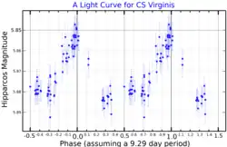 - ↑ Ozuyar, D.; et al. (2018), "Photometric Variability of the MCP Star CS vir: Evolution of the Rotation Period", Publications of the Astronomical Society of Australia, 35, arXiv:1712.00832, Bibcode:2018PASA...35....4O, doi:10.1017/pasa.2017.69, S2CID 54071984.