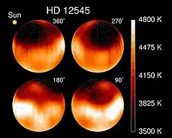 - ↑ Strassmeier, K. G. (July 1999). "Doppler imaging of stellar surface structure. XI. The super starspots on the K0 giant HD 12545: larger than the entire Sun". Astronomy and Astrophysics. 347: 225–234. Bibcode:1999A&A...347..225S. Retrieved 18 April 2022.