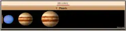 There are three known exoplanets in orbit around HD 125612 A. The first was reported in 2007 and designated HD 125612 b, but it did not fully resolve the stellar velocity variations and it was clear there were other companions.[9] Two additional companions, HD 125612 c and d, were reported in 2009.[4] In 2022, the inclination and true mass of the outer planet HD 125612 d were measured via astrometry.[10]