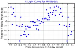 The stellar classification of HN Boo is K3V,[4] which indicates this is a K-type main sequence star. Klaus G. Strassmeier et al. announced that the star's brightness varies, in the year 2000.[1] It was given its variable star designation in 2006.[10] It is a BY Draconis-type variable, randomly varying in brightness by 0.04 in magnitude over a period of 11.54 days[5] due to star spots and high chromospheric activity. The star exhibits strong emission, which suggests an age of 0.5–1.0 billion years.[8] It has 82% of the mass of the Sun and 78% of the Sun's radius. The metallicity of the star, meaning its abundance of heavier elements, appears slightly higher than in the Sun. It is radiating 31% of the luminosity of the Sun from its photosphere at an effective temperature of 4,863 K.[6]