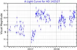 HD 142527 is listed in the International Variable star index as a UX Orionis variable, with a visible-light magnitude ranging from 8.27 to 8.60.[10]