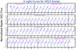 The variability of HD 142990 was discovered in 1977 by Holger Pedersen and Bjarne Thomsen, during a spectroscopic and photometric study of helium weak and helium strong stars.[14] In 1978 the star was given the variable star designation V913 Scorpii.[15] Far more extensive photometric data were provided by the Kepler K2 program, which sampled the light curve well, and allowed Dominic Bowman et al. to measure the star's 0.978832±0.000002 day rotation period.[7]