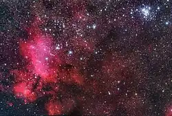 HD 152408 lies in the north of the open cluster NGC 6231, the center of the OB association Scorpius OB1; it is not clear whether it is a part of the association or not.[11] With an apparent magnitude of about 5.8, it is the third brightest Wolf-Rayet star. The other Wolf-Rayet stars that can be seen with the naked eye (although it can only be seen with the naked eye under excellent viewing conditions) are γ2 Velorum (WR 11), θ Muscae (WR 48), WR 22, WR 24 and HD 151932 (WR 78).