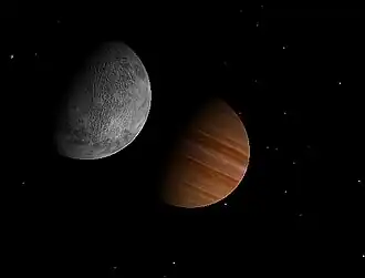 ![]() Planet HD 154345 b (min mass ~1 MJ) in the background with two hypothetical moons visible. Image was created with Celestia V1.41 using a custom map for the Planet and its moons | |