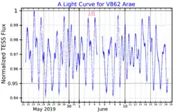 The Hipparcos data revealed that HD 158220 is a variable star. It was given its variable star designation, V862 Arae, in 1999.[8]
