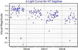 HD 183143 was listed as being variable in 1976, with a very small amplitude.[11] During the Hipparcos mission, its brightness was observed to vary between magnitude 6.71 and 6.95. ASAS-3 photometry shows a period of 40.44 days.[3] HD 183143 was formally announced as a variable star, probably of the α Cygni type, in 1979 and given the variable star designation HT Sagittae.[12]
