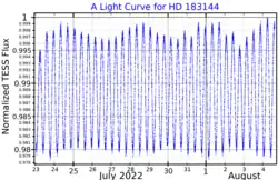 Results from the MASCARA experiment indicate that HD 183144 is a pulsating variable star with a period of 0.3649 days, during which it varies by 0.01 magnitude in white light.[14][15] It has a mass five times that of the Sun and, at an age of 160 million years, has already evolved away from the main sequence. It has expended to nearly six times the radius of the Sun and, with an effective temperature of 15,139 K, it has a bolometric luminosity of 2,676 L☉.