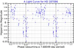 HD 187086 fluctuates between 5.95 and 6.07[3] and its variability was first noticed by P.M. Corben in 1971 after being listed as an ordinary M-type giant a year prior.[6][18] In 2002, Chris Koen and Laurent Eyer reported that the Hipparcos data shows periodic fluctuations with an amplitude of 0.023 magnitudes, and a period of 7.6805 days.[19] As of 2004 however, it is not confirmed to be variable.[20]
