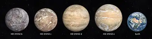 HD 215152 has a total of four confirmed sub-Neptune mass planets, all of which are potentially rocky. With all of the planets orbiting within 0.154 AU, it is a very compact system. The inner two are separated by only 0.0098 AU, or about four times the distance between the Earth and the Moon. This is unusual for systems discovered by radial velocity measurements.[13] In 2011, it was reported that two planetary candidates (c and d) had been detected in close orbit around this star. The planets were discovered through Doppler spectroscopy using the HARPS spectrograph at La Silla Observatory in Chile. Their presence was revealed by periodic variations in the radial velocity of the host star due to gravitational perturbations by the orbiting objects.[14] In 2018, two more planets were confirmed.[13] All planets have brief orbital periods: the four planets orbit every 5.76, 7.28, 10.86 and 25.2 days respectively.[13] Their minimum masses range between 1.7 and 2.9 Earth masses.