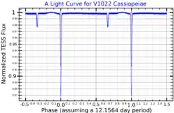 HD 224355 was discovered to be a spectroscopic binary by Harry Hemley Plaskett of the DAO, in 1919.[9] Many additional spectra were obtained at the DAO in 1922, and orbital elements of the binary were first published in 1923. The orbit was found to have a significant eccentricity of 0.278.[10] Because the physical separation of spectroscopic binaries is often relatively small, they are good candidates to be eclipsing binaries. For that reason, in 1924 Joel Stebbins included HD 224355 in an early photo-electric photometry study, and observed a "suspect eclipse".[11] That led to the star being listed in the New Catalogue of Suspected Variable Stars as NSV 14773.[12] Hipparcos data confirmed that HD 224355 is an Algol-type eclipsing binary.[13] In 2008 it was given the variable star designation V1022 Cassiopeiae.[14]