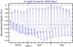V834 Tauri is a BY Draconis variable with maximum and minimum apparent magnitudes of 7.94 and 8.33 respectively,[3] so it is never visible to the naked eye.