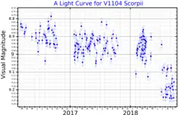 HD 326823, also known as V1104 Scorpii, is a binary star containing a unique emission-line star, which is in the midst of transitioning to a nitrogen-rich Wolf-Rayet star, as well as being a candidate Luminous blue variable, located 4,142 light years away in the constellation of Scorpius. The primary is very evolved, because it is composed of almost entirely helium, and only 3% of it is still hydrogen,[4] and it has lost most of its mass to the now-very-massive secondary. The underlying mechanisms and mass transfers in the system are comparable to other W Serpentis systems, such as Beta Lyrae and RY Scuti.[4]
