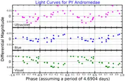 ![]() Ultraviolet, blue and visual band light curves for PY Andromedae, plotted from data published by Catalano and Leone (1991)[1] | |