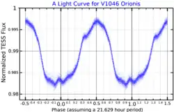 The primary is a helium-strong, magnetic chemically peculiar star[15] with a stellar classification of B1.5 Vp.[5] It has a magnetic field strength of 7,700 G,[16] and the helium concentrations are located at the magnetic poles.[17] V1046 Orionis was found to be a variable star by L. A. Balona in 1997,[11] and is now classified as an SX Arietis variable.[7] The star undergoes periodic changes in visual brightness, magnetic field strength, and spectral characteristics with a cycle time of 0.901175 days – the star's presumed rotation period.[11] Radio emission has been detected that varies with the rotation period.[17]
