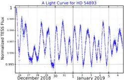 In a 1971 paper, HD 54893 is mentioned as being a confirmed β Cephei variable, but with no explanation of when it was discovered.[11] A 1971 thesis dedicated to β Cephei variables only mentions HD 54893 as a non-variable early B star.[12] In a 1977 search for β Cephei stars, it is listed as possibly being variable.[13] It is catalogued as a suspected variable star, but not confirmed.[4]