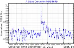 ![]() A light curve for HD 59640, plotted from TESS data,[1] showing a flare whose flux peaked at UT 15:27.[2] | |