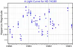 HD 74180 is a single[12] star in the constellation Vela. It is a yellow-white F-type supergiant with a mean apparent magnitude of +3.81 and a spectral classification F8Ib. Estimates of its distance to Earth vary between 3,200 and 8,300 light-years.