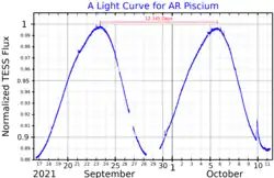 ![]() A light curve for AR Piscium, plotted from TESS data,[1] the 12.345 day variability period[2] is shown in red. | |