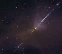 HH 111 is a Herbig–Haro object in the L1617 dark cloud of the Orion B molecular cloud[2] in the constellation of Orion. It is a prototype of a highly collimated optical jet sources. It shows several bow shocks and has a length of about 2.6 light-years (0.8 parsec).[3]