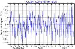 The companion star HK Tauri B is surrounded by a protoplanetary disk visible nearly edge-on. It contains water and carbon dioxide ices, along with gaseous carbon monoxide.[7] The disk is unusually flat, with an aspect ratio of 4.4, while most young stars host disks with aspect ratios of about 3.[8] The disk also contain relatively few large dust particles compared to fine dust, with a size distribution power-law slope of 4.2. The disk mass is relatively small, not larger than 0.0005M☉, and dust distribution is asymmetric.[9] The plane of the disk is not aligned with the orbit of the binary.[10]