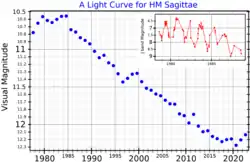 ![]() A light curve for HM Sagittae. The main plot shows 1-year averages of AAVSO visual band data.[1] The inset plot (adapted from Munari and Whitelock[2]) shows near-infrared variability arising from the red giant's pulsations. | |