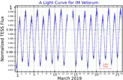 ![]() A light curve for IM Velorum (HR 3831), plotted from TESS data.[1] The 2.852 day period[2] is shown in red. | |