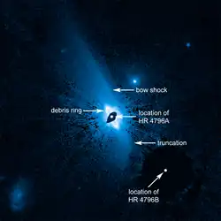 In 1991, the primary was found to have an excess of infrared emission, implying that it has a circumstellar debris disk. Observations using the Near-Infrared Multi-Object Spectrometer aboard the Hubble Space Telescope in 2007 indicated that the dust had a reddish spectrum similar to that of tholins.[14] The disk was resolved with the Hubble Space Telescope in 2009, confirming that it exists. Based on these images, the disk has a radius of 75 AU and a width of less than 18.5 AU. It may have some asymmetries and the center appears to be slightly offset from the star. The dust in the disk is likely the result of collisions between larger particles.[3] In 2011, observations of the ring offset by the Subaru Telescope implies that one or more planets would likely exist within gaps tugging at its dust grains.[15][16] With a new image in 2014, the configuration and alignment of the dust ring and HR4796A has been nicknamed "Eye of Sauron".[11][12]