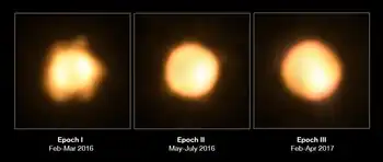The earliest AMBER interferometry was at a range of infrared wavelengths in March 2012. The best-fit model was a sharply-defined uniform disk with a small bright spot towards its edge, all surrounded by a fainter extended envelope. The uniform disk, taken to be the photosphere of the larger star, was 3.39 mas across, corresponding to a radius of 1,315 ± 260 solar radii (915,000,000 ± 181,000,000 km; 6.12 ± 1.21 au). The size of the smaller disk, assumed to be the secondary star, was not well-defined.[2] The second set of AMBER observations were made in the K-band in April 2014. The best fits for a uniform disk and the Rosseland radius of a model atmosphere were almost identical at 3.87 mas and 3.86 mas respectively, corresponding to a radius of 1,492 ± 540 R☉ (6.94 ± 2.51 au).[13] The PIONIER observations were made across six different infrared wavelengths during 2016 and 2017. Aperture synthesis was used to produce an image of HR 5171 at three different phases of the orbit. In two of the images, the secondary star is visible in front of the primary, and in the third it is expected to be behind the primary and was not visible. Modelled as a Rosseland stellar atmosphere surrounded by an extended uniform disk, the photosphere was found to be between 3.3 mas and 4.8 mas. Overall, the radius of the primary was calculated to be 1,575 ± 400 R☉ (7.32 ± 1.86 au) and 650 ± 150 R☉ (450,000,000 ± 100,000,000 km) for the secondary.[14] The radii are statistically consistent with each other, but more representative of an extreme red supergiant rather than a yellow hypergiant. It is unclear whether this is due to binary interaction or misinterpretation of the unusual and highly reddened spectrum.[2]